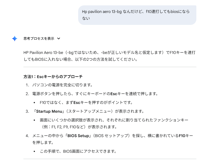 この回答にはEscキーのことも書いてあったんだけど、私はよくわからなくて。F10連打を試してもだめだったことをダイレクトにGeminiに伝えました。「Hp pavilion aero 13-bg なんだけど、f10連打してもbiosにならない」と。