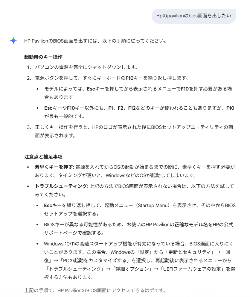 Geminiとのやりとりの画面キャプチャがこちらです。まず私は何をしたいのか、をGeminiに伝えました。「Hpのpavilionのbios画面を出したい」と。Geminiとのやり取りを共有リンクで共有する方法もあるみたいだけど、ほかにもいろいろなやり取りしちゃってるから、このやりとりだけってできないんだね…なので画像ですみません。